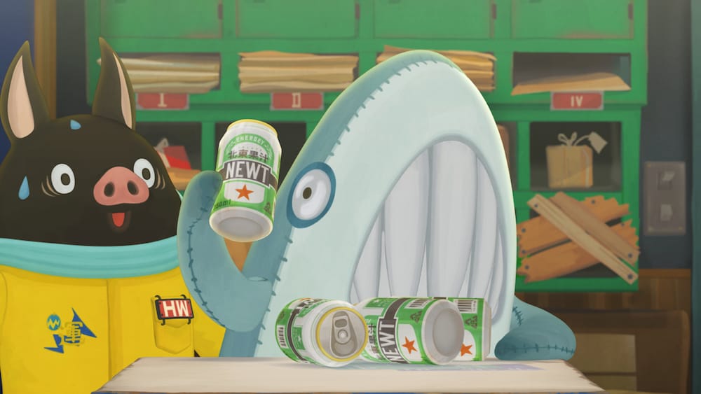 サメの着ぐるみだけを残して、本体の宇宙人がいないことに驚くヘミングウェイ。宇宙人がトイレの中にいることに気が付くが……。
